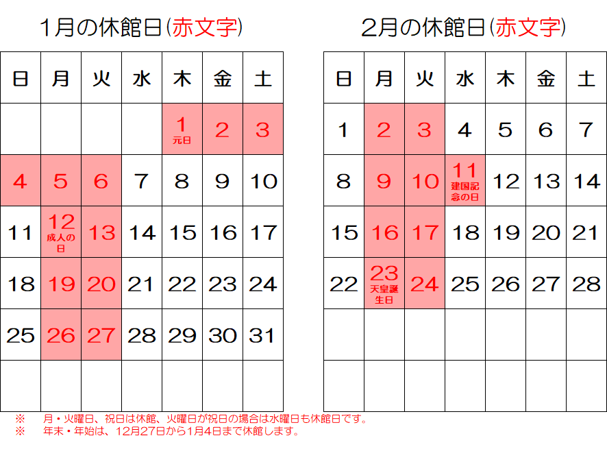 月曜日、火曜日、祝日(火曜日が祝日の場合は水曜日も休館日)