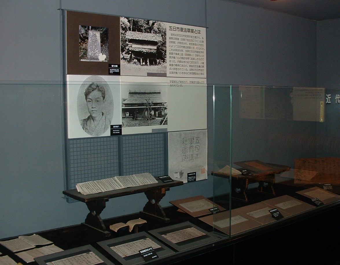 五日市憲法草案の関係資料である学芸講談会の開催通知や討論の題目を記したノートなどを展示しています。また、黒八丈関係資料や考古資料も展示しています。