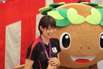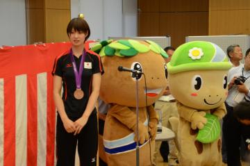 銅メダル獲得の報告や市民の方からの質問に笑顔で答える木村選手