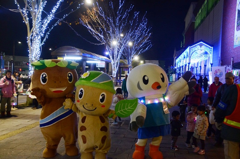 森っこサンちゃんとゆりーとは、イルミネーションを背に記念撮影。