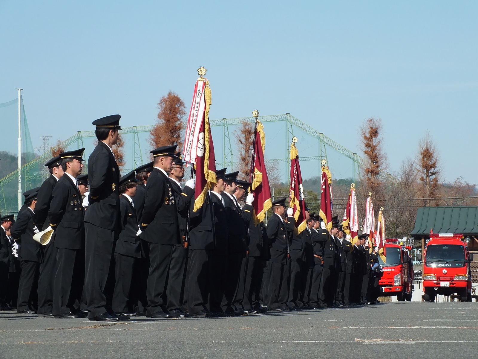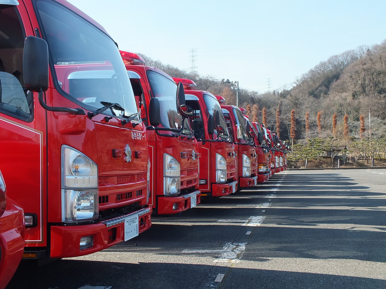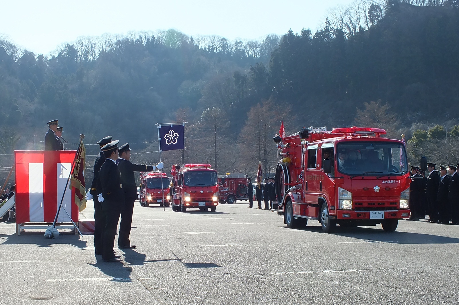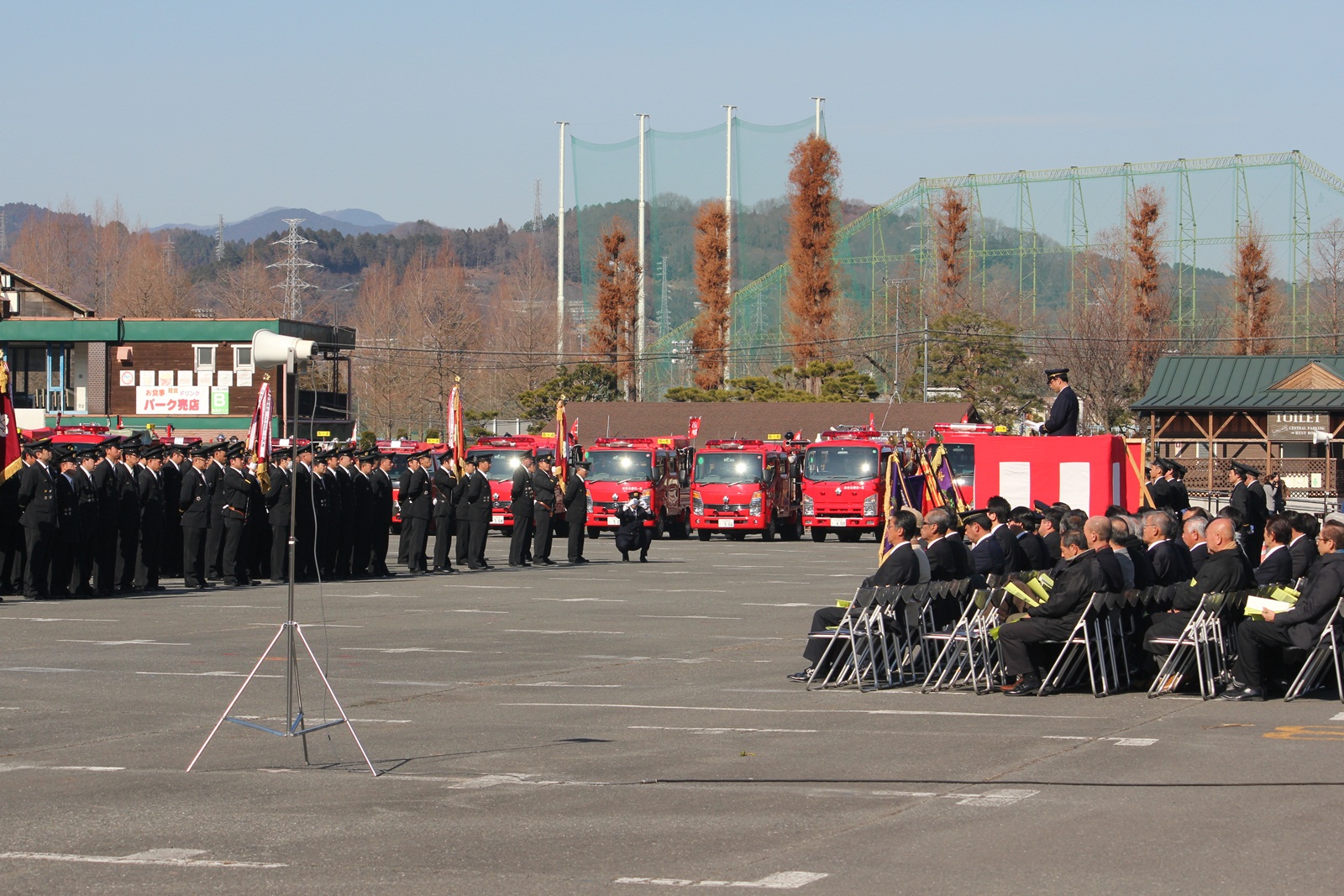 1月13日、青空の下、消防団出初式をサマーランドファミリーパーク駐車場で行いました。現在、あきる野市消防団は7個分団23部で構成され、475人の団員が、献身的な活動で地域の安全を支えています。消防ポンプ自動車など車両25台による分列行進があり、団員たちの精悍な姿を披露しました。