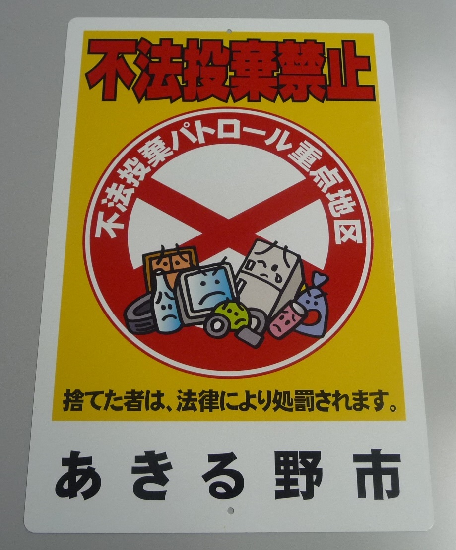 不法投棄している者を見つけた場合、また不法投棄が度重なる場合は警察へ連絡してください。また市役所3階生活環境課で不法投棄禁止看板を用意しておりますので、問い合わせしてください。