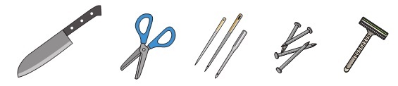- 硬い容器などに入れて、不燃ごみ袋の表面に「鋭利なものあり」と表示して出してください。