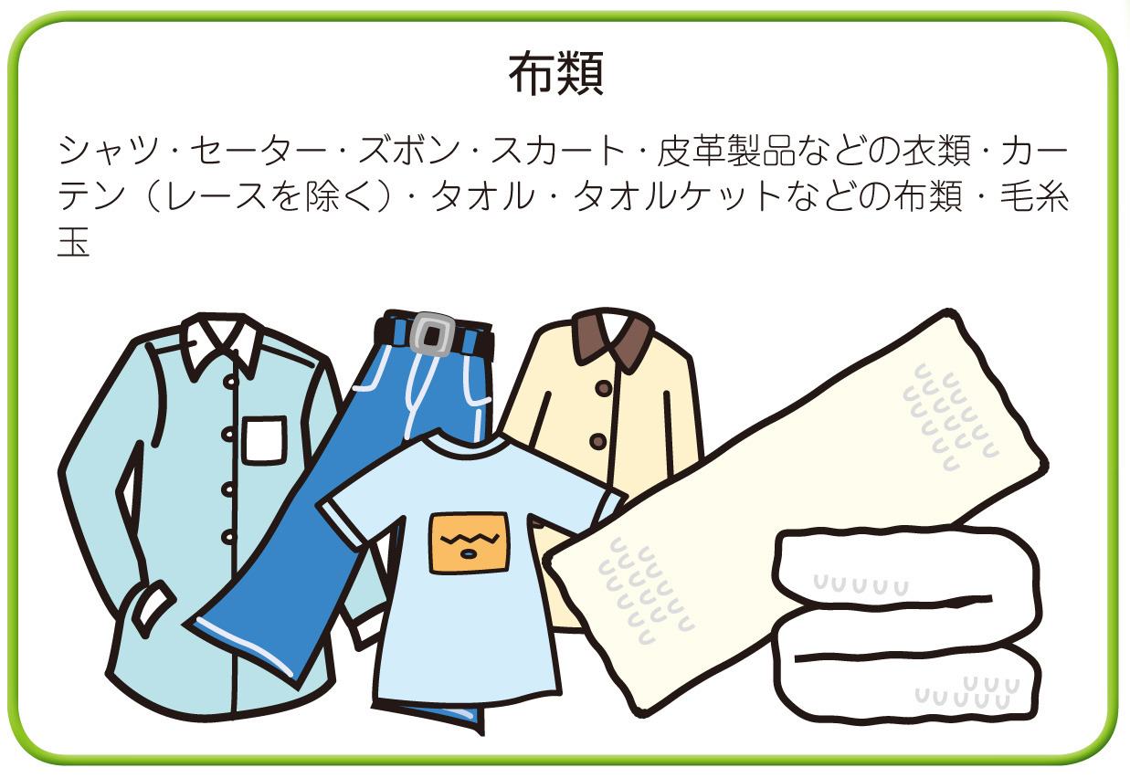 シャツ・セーター・ズボン・スカート・皮革製品などの衣類・カーテン・タオル・タオルケット等の布類・毛糸玉