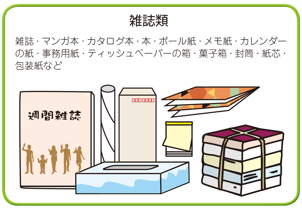 雑誌、マンガ本、カタログ本、、本、ボール紙、カレンダーの紙、メモ紙、ティッシュペーパーの紙箱・事務用紙・菓子箱・画用紙・封筒・紙芯・包装紙など