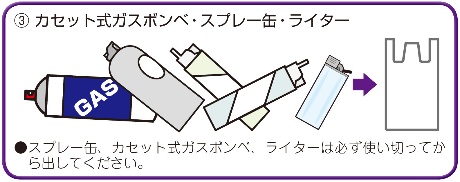 •スプレー缶、カセット式ガスボンベ、ライターは必ず使い切ってから出してください。