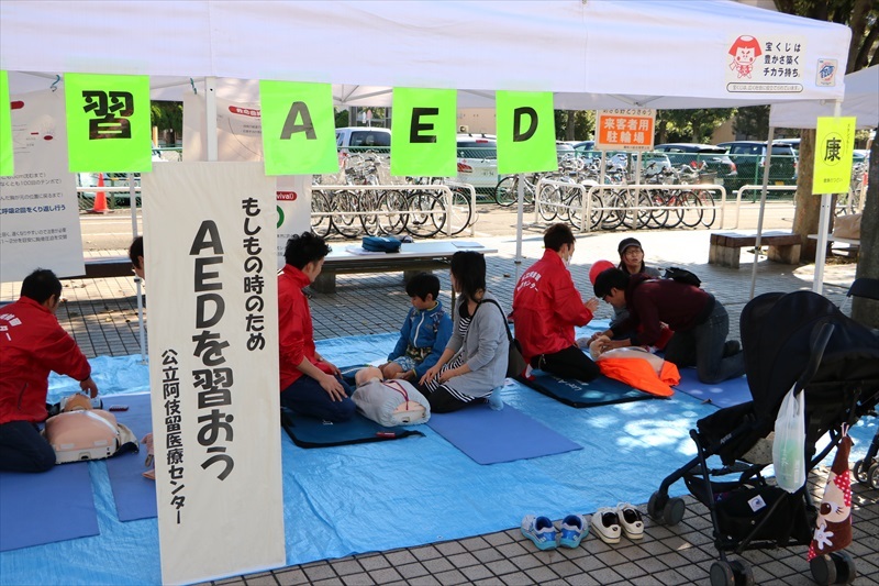 10月15日、晴天に恵まれた青空の下、あきる野ルピアと秋留野広場で「第21回あきる野市健康のつどい」が開催されました。秋留野広場では、市民団体の活動発表やAEDの救命講習、薬物乱用防止PRなどを行いました。また、あきる野ルピアでは、健康づくり市民推進委員会の委員・活動の紹介や講演、体組成・血管年齢・骨密度測定などが行われ、多くの方が参加し、健康について興味を持たれていました。
