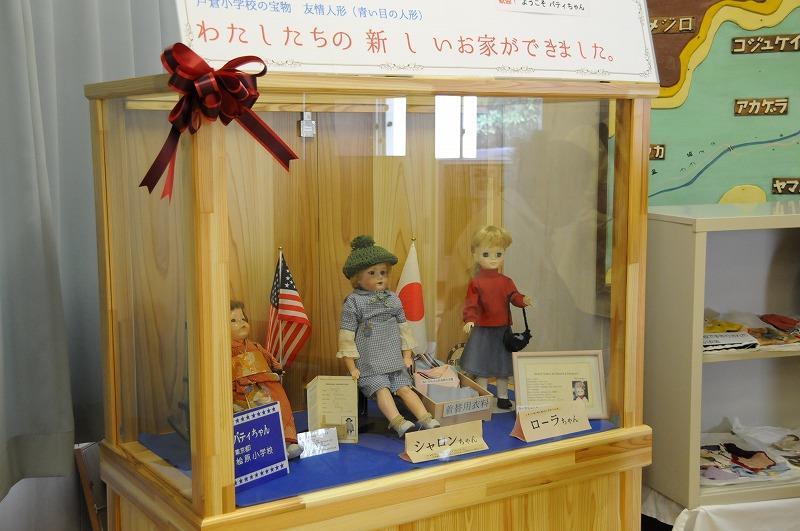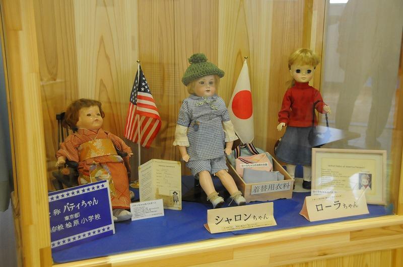 友情人形の展示〔パティちゃん(左)、シャロンちゃん(中)、ローラちゃん(右)〕