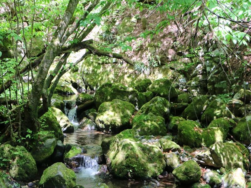 道中の大岳沢では、濃い緑色の苔に覆われた岩の間を清流が流れています。