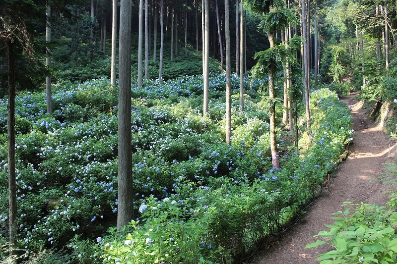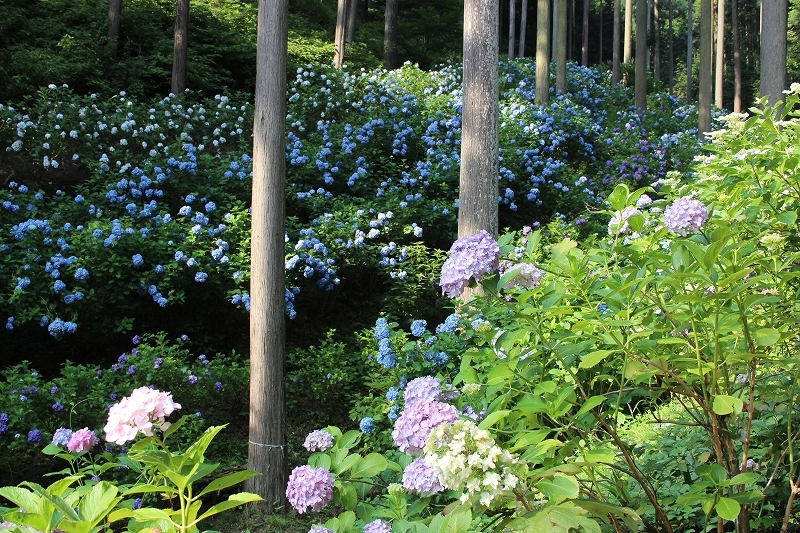 南沢あじさい山は、市内の深沢地区にある紫陽花の名所で約1万株の紫陽花が急峻な山間で木々を覆うように広がっています。