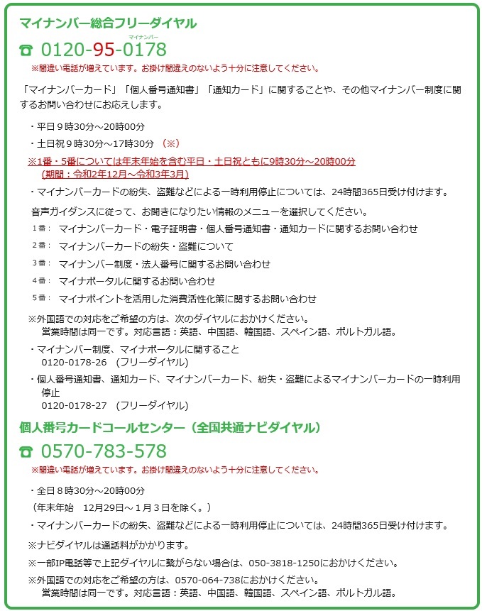 マイナンバー総合フリーダイヤル、個人番号カードコールセンター