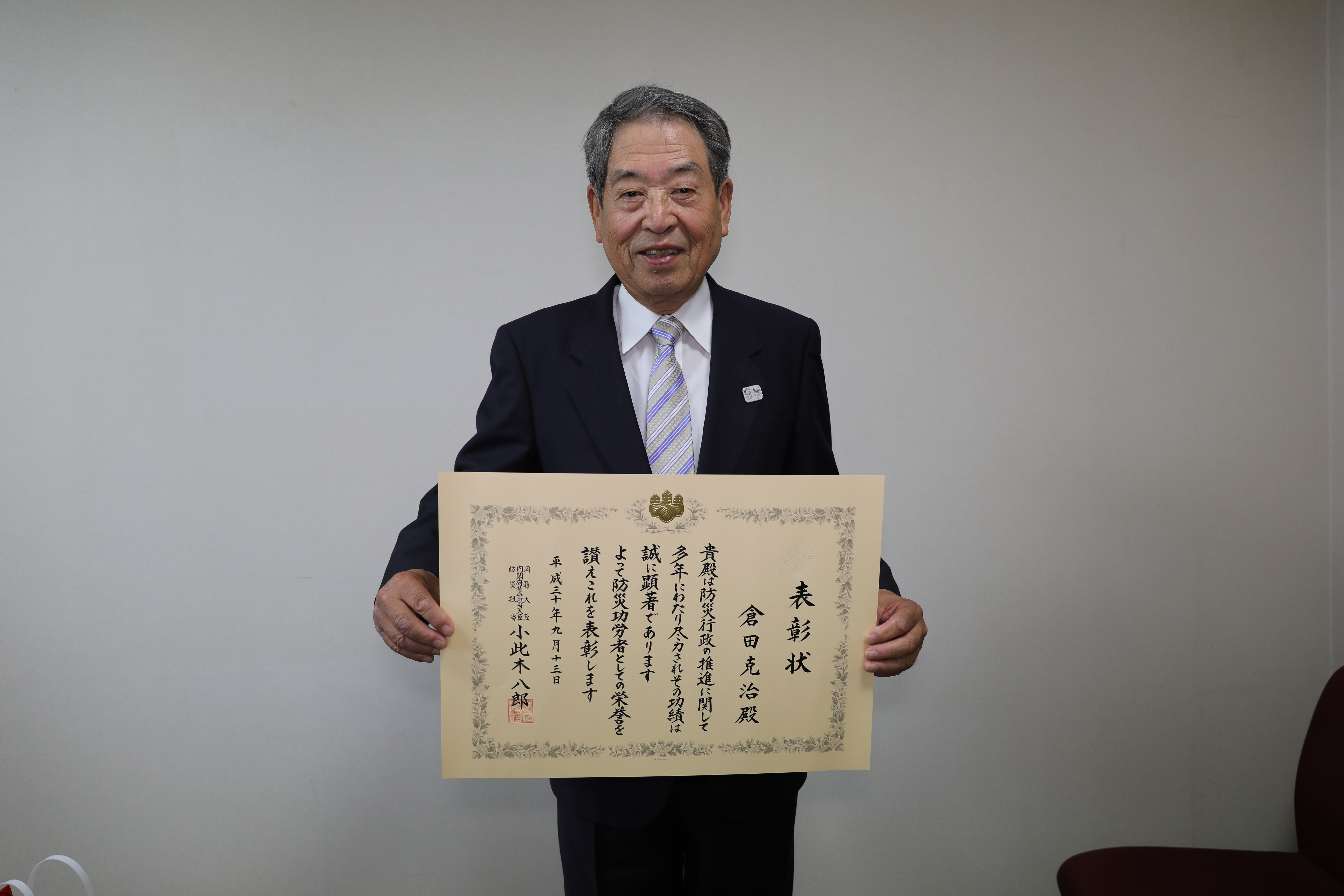 倉田克治氏(前あきる野市防災・安心地域委員会本部長)が、「平成30年度防災功労者担当大臣表彰」を受賞し、平成30年9月13日、中央合同庁舎(東京都千代田区)にて、小此木内閣府特命担当大臣(防災)より授与されました。