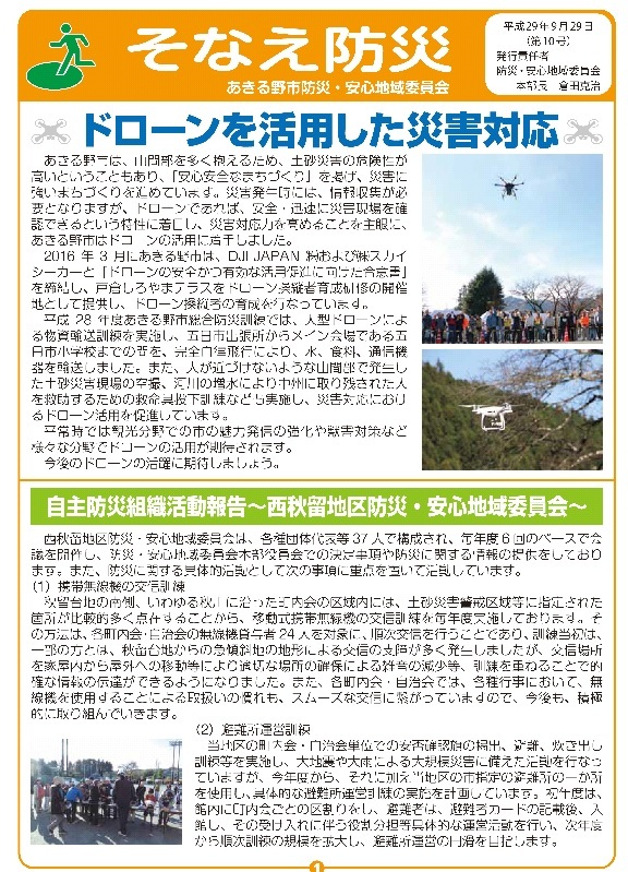 そなえ防災第10号(サイズ:2.17MB)ドローンを活用した災害対応/自主防災組織報告~西秋留地区防災・安心地域委員会~/風水害時の避難方法を確認しよう/あきる野市地域防災計画が修正されました/市HPに防災・安心地域委員会のページが掲載されました