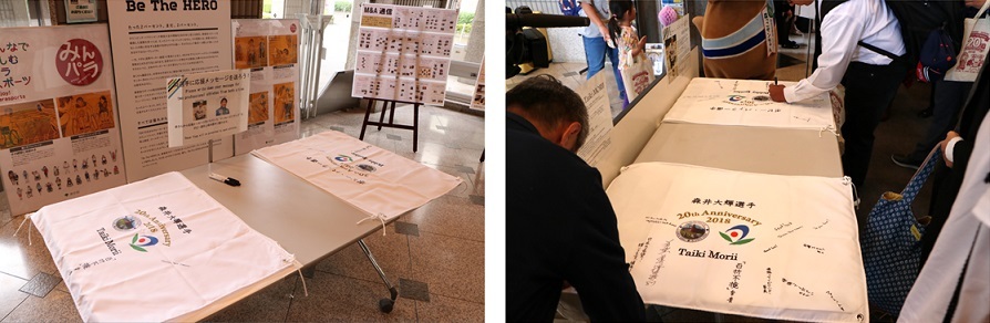 2020年東京オリンピック・パラリンピック競技大会関連パネル展示のほか、あきる野市出身のパラリンピアン森井大輝選手とマールボロウ市出身のオリンピアン ボビー・バトラー選手へのメッセージフラッグへの寄せ書きも行いました。