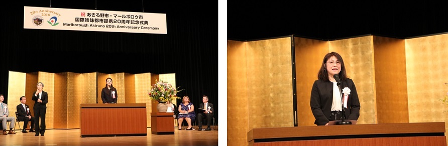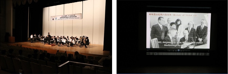 10月14日(日曜日)、秋川キララホールにてあきる野市・マールボロウ市国際姉妹都市提携20周年式典が開催されました。小雨の降る中、300人を超える来場者を迎え、式典は盛大かつ和やかに執り行われました。