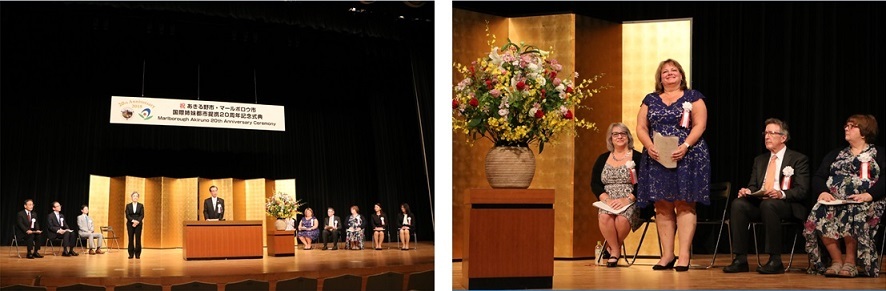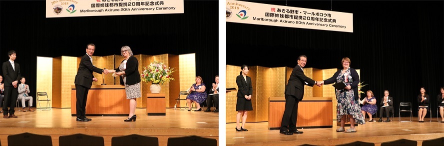 相互に記念品を交換した後、長年に渡る貢献をたたえ、マールボロウ市議会議員ドナルド・ランダース氏(当日は欠席)、ナンシー・クライン氏、マールボロウ市ウィットコムスクール、あきる野市国際化推進青年の会及びあきる野ホストファミリークラブに感謝状が贈呈されました。