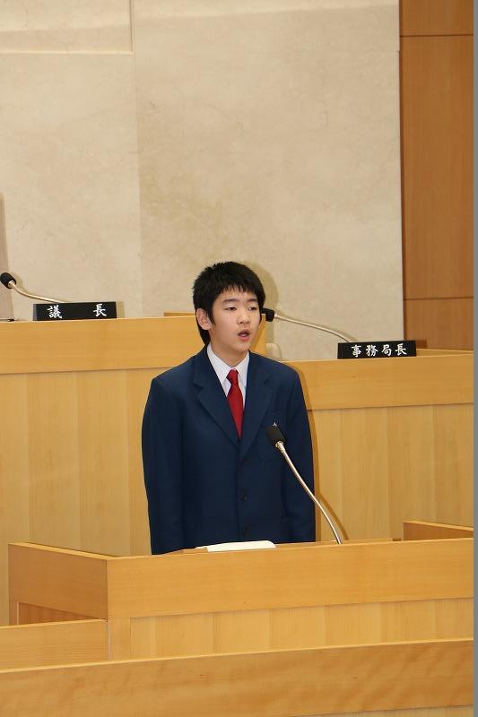 あきる野市議会では、平成31年開会会議に先立ち、中学生の主張大会最優秀賞受賞者である増戸中学校2年生清水太陽さんが議員や関係者が見守る中、作品を発表しました。