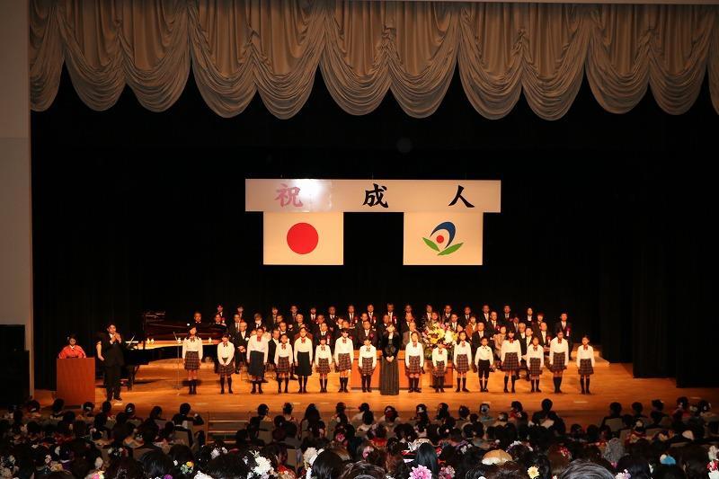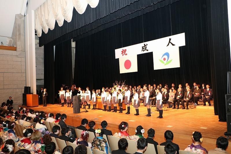 会場には、645人の新成人が参加し、市長や議長からお祝いの言葉や、あきる野児童合唱団アヴニールの子ども達から「この星に生まれて」「花は咲く」の歌のプレゼントがありました。