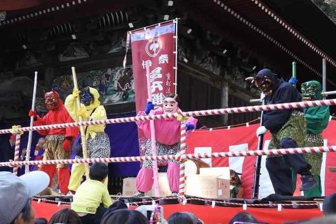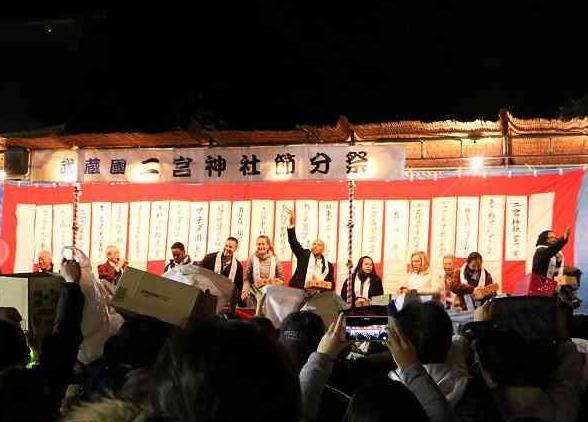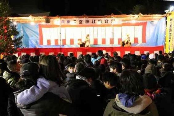 午後5時30分からお練り、午後6時から秋川歌舞伎の一部上演、午後6時10分から豆まきが行われました。