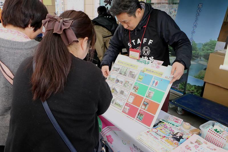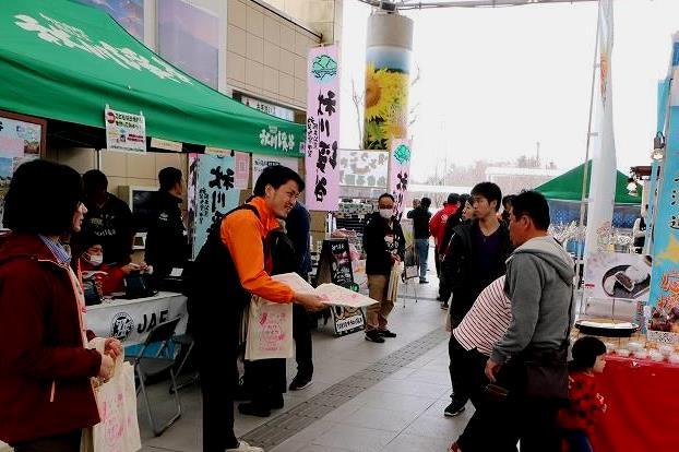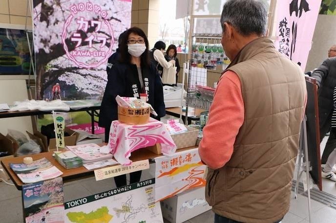 このイベントは、春の観光シーズンに向けて市内の桜や梅のスポット、イベント等をPRするため行うもので、観光協会、観光協会青年部、小峰ビジターセンター、JAF、(株)東京サマーランド、瀬音の湯の皆さんのご協力をいただき、観光パンフレットが入ったエコバックの配布(約2000部)などを実施しました。