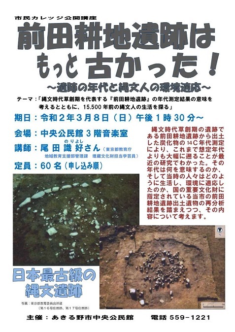 前田耕地遺跡では、発見当時、13,000年前の日本最古の縄文時代草創期の住居跡がはじめて発見されました。