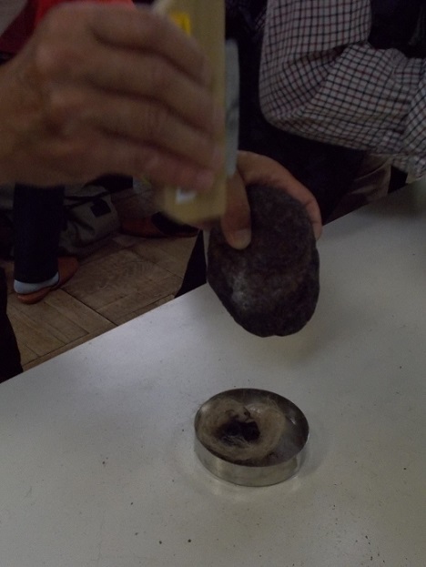 火打ちがねとチャートでの火起こし実験の様子(市民カレッジ「自然史1」)