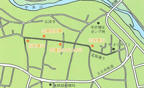 二宮地区にある「秋葉山大権現の石灯篭」「火伏のお地蔵さま」の位置