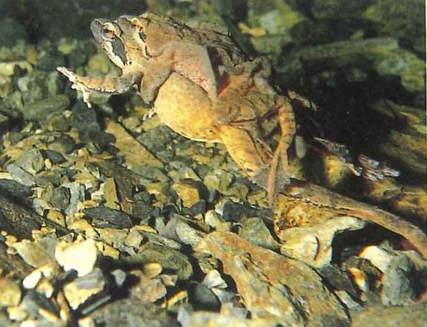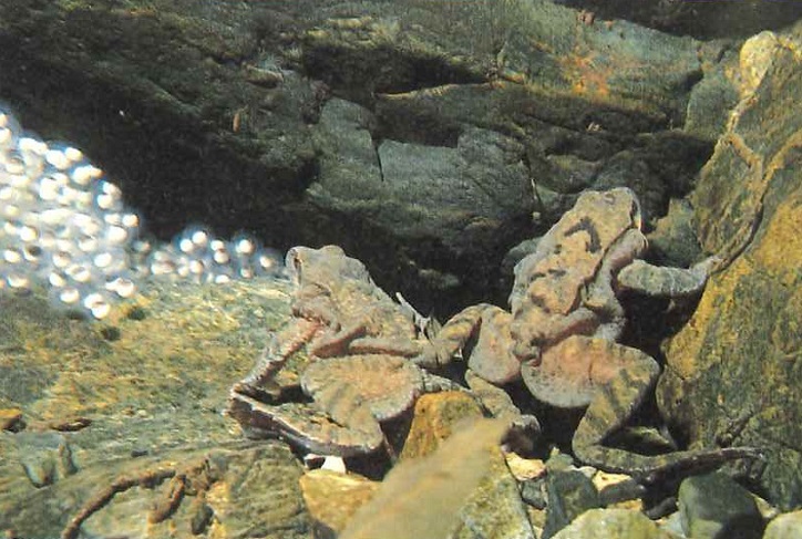 うまくペアになれたカエルは、すぐに産卵しないで、ペアになったまま50~100m川を下っていき、少し深くなった石の下に入り、石にくっつけて産卵します。