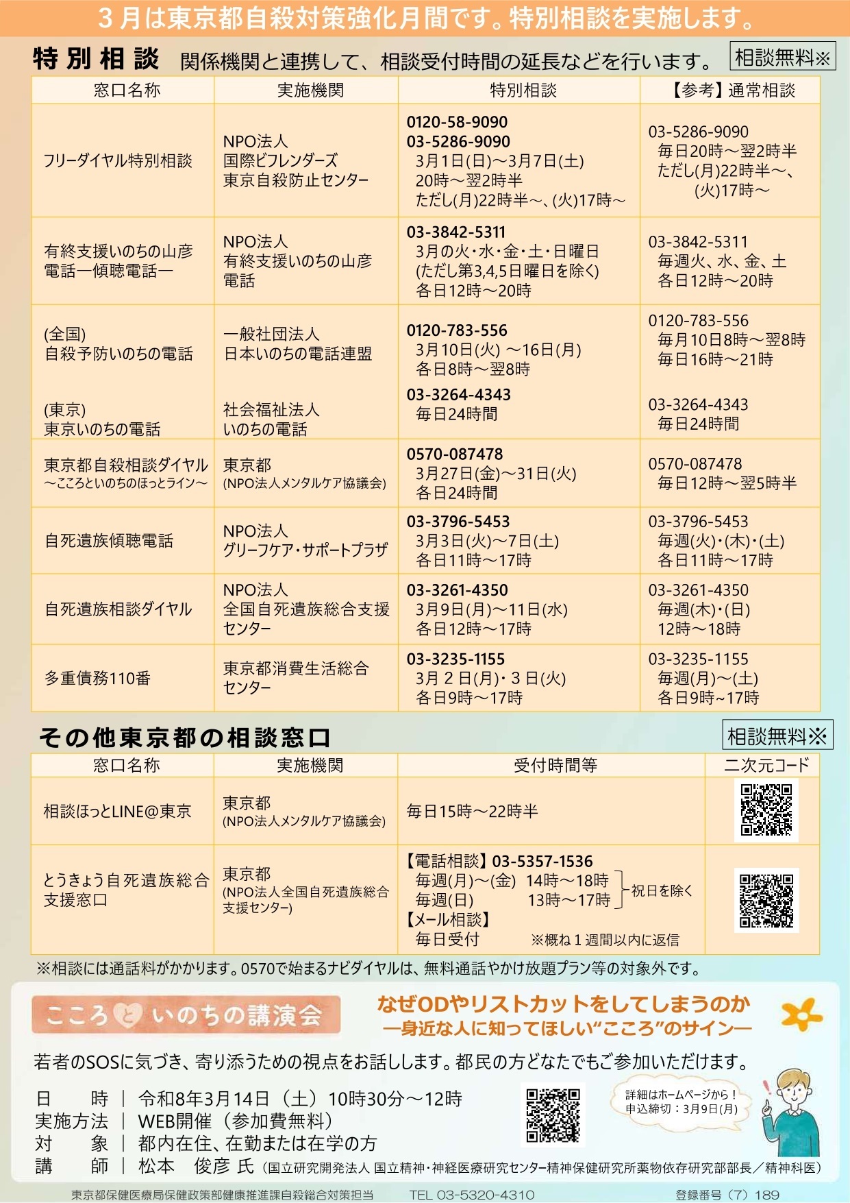 東京都では、3月は「自殺対策強化月間」と位置づけ、重点的に相談事業や普及啓発に取り組んでいます。