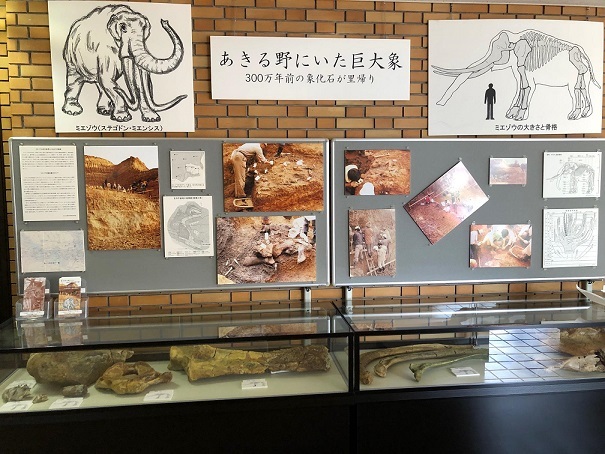 五日市郷土館内の「地質コーナー」とあきる野市役所五日市出張所の「1階展示ケース」には、昭和53年に網代地区のごみ処分場建設現場から偶然発見された、巨大ゾウの化石の一部が展示されています。