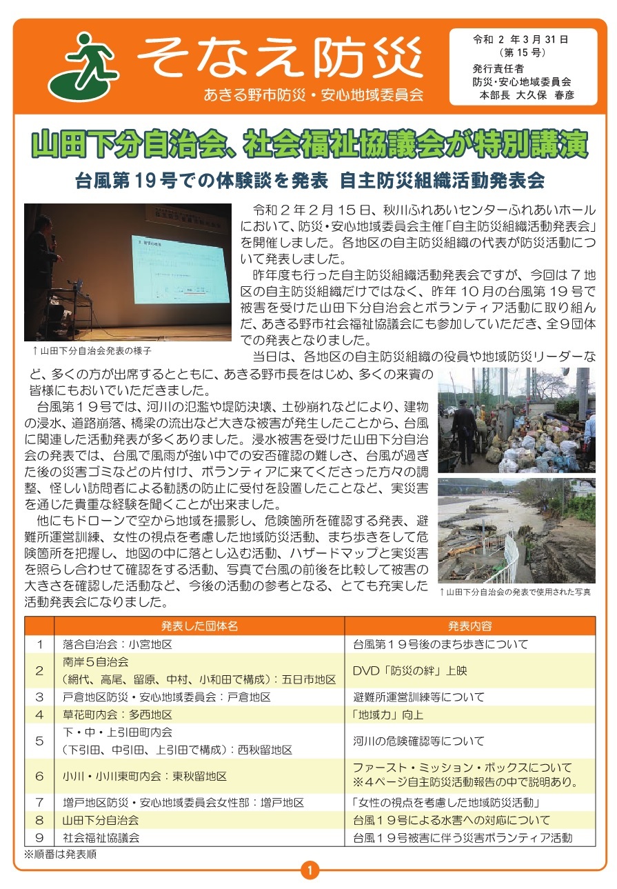 そなえ防災第15号(サイズ:2.10MB)山田下分自治会、社会福祉協議会が特別講演/風水害時に避難するときのポイント/第9回防災コンクール開催/自主防災組織活動報告 東秋留地区防災・安心地域委員会