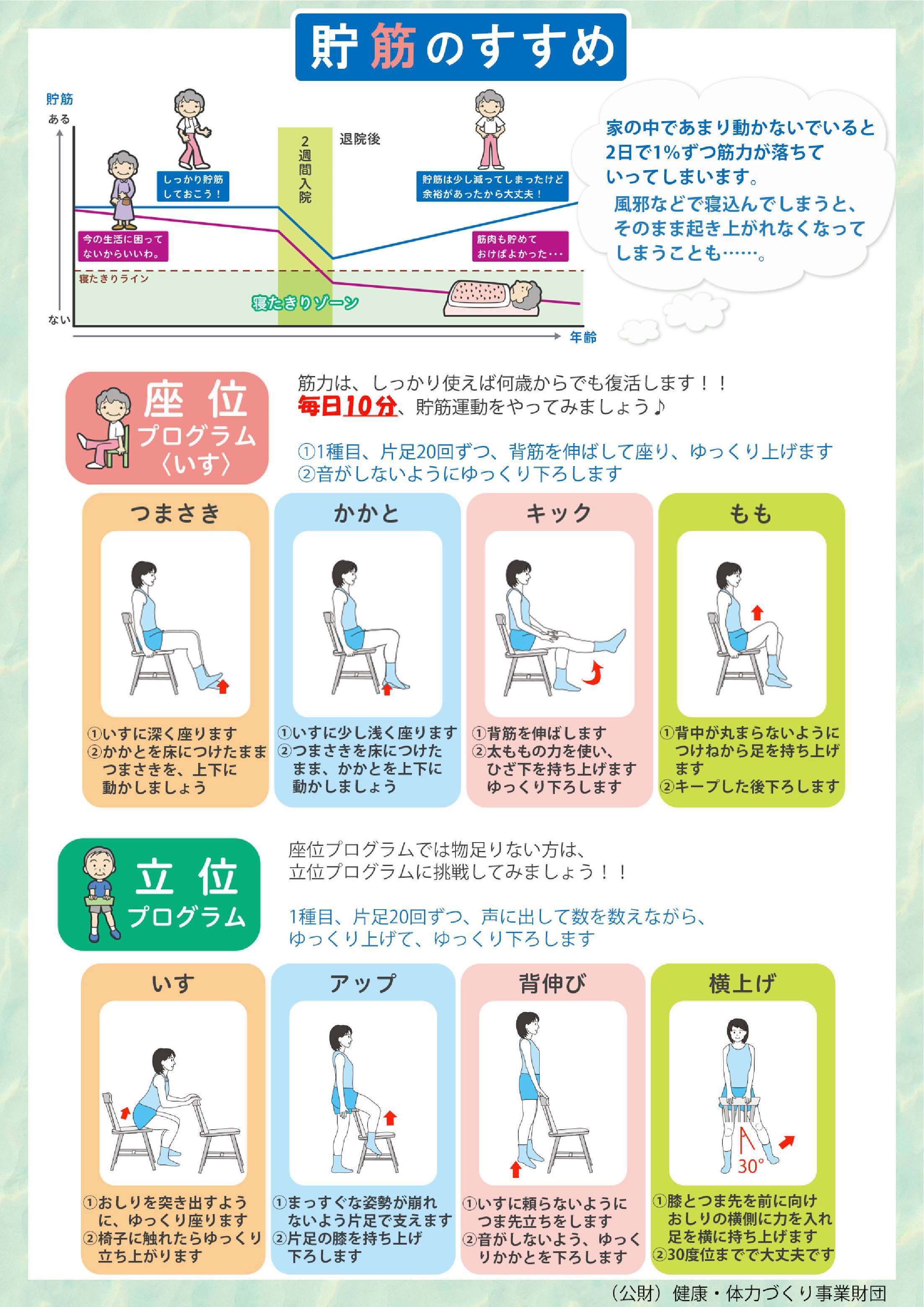 座位プログラム・立位プログラム (ファイル名:chairmotin.pdf サイズ:4.14MB)無理のない範囲で、毎日継続してみましょう。
