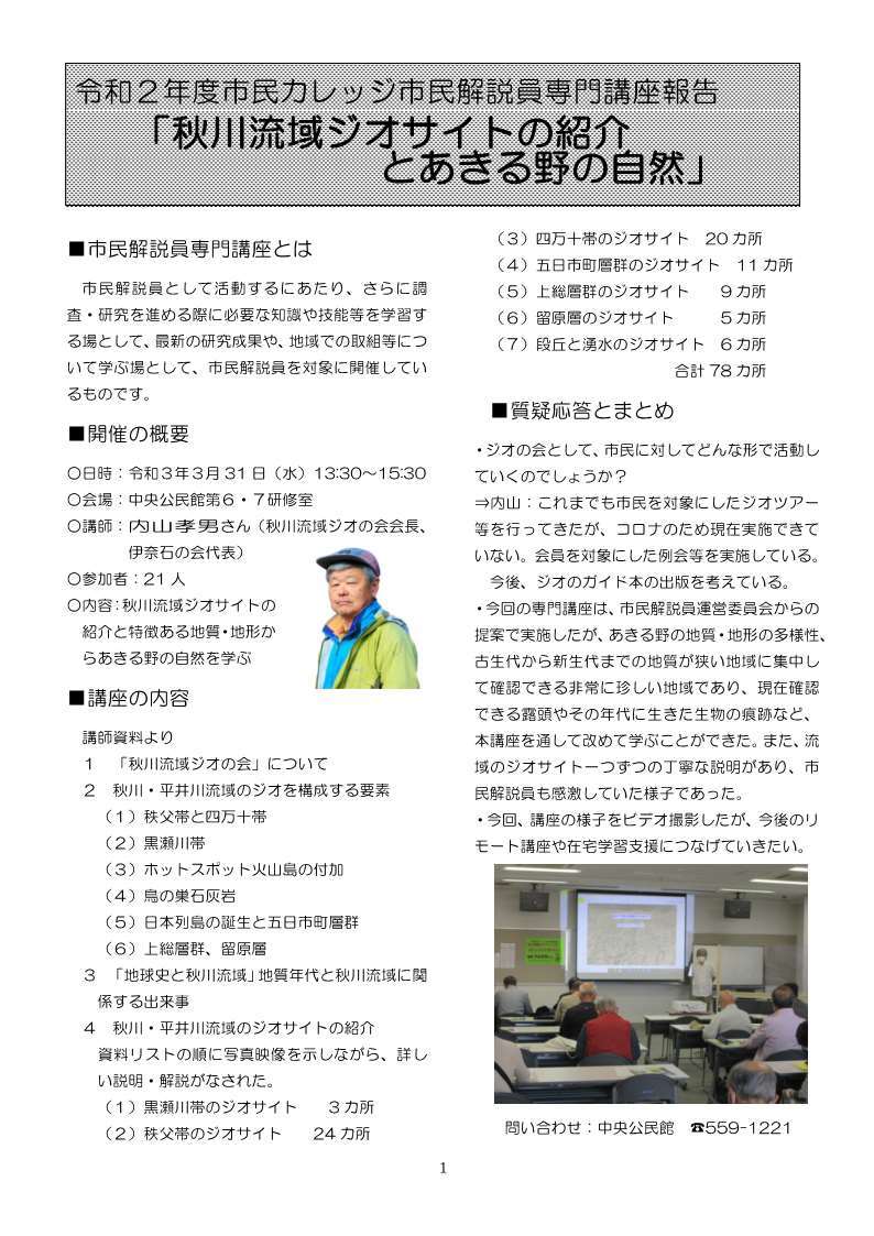 ここでは、令和2年度市民カレッジ専門講座2「秋川流域ジオサイトの紹介とあきる野の自然」と題して、令和3年3月31日に開催された講座の実施報告をお知らせいたします。