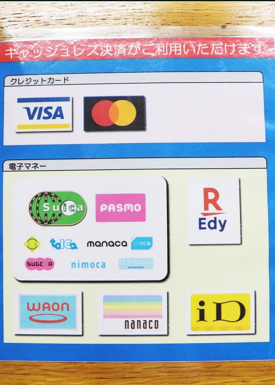 クレジットカード(ビザ、マスターカード)、交通系電子マネー(スイカ、パスモなど)、
