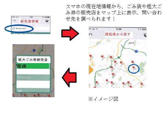 粗大ごみ処理券や、不燃ごみ有料袋の「ばら売り」対応販売店を、現在地情報からマップ上に表示できるようになります。また、地区ごとにリスト表示も可能です。