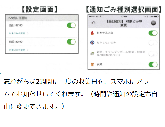 忘れがちなごみ収集日をアラートでお知らせできます。