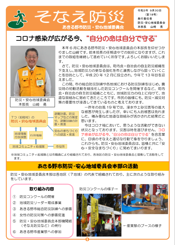 そなえ防災第18号 (サイズ:2.80MB)コロナ感染が広がる今、”自分の命は自分で守る”/あきる野市防災・安心地域委員会本部の活動/そなえ防災を振り返ろう/自主防災組織活動報告《網代自治会の防災活動》