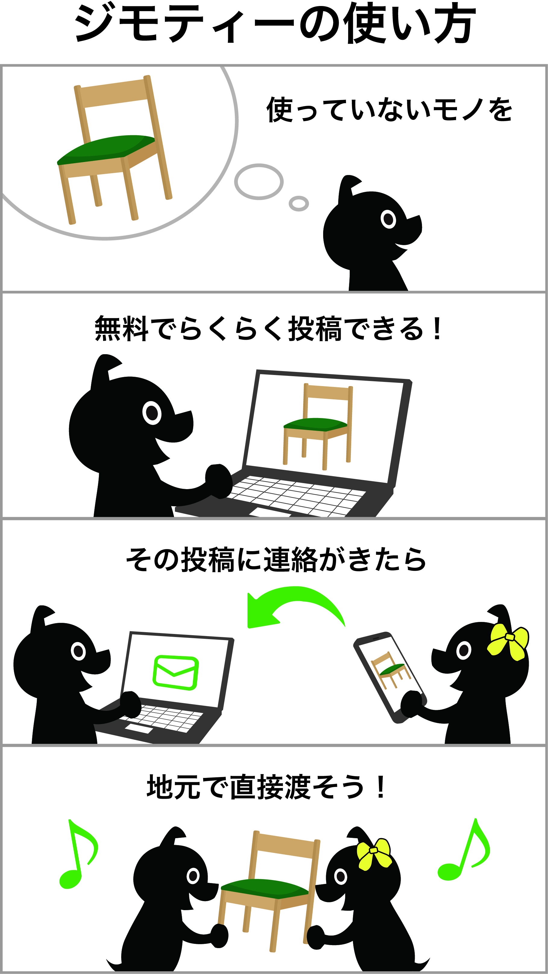 ジモティーでの取引の流れについては、https://jmty.jp/about/what_is_jmty をご覧ください。