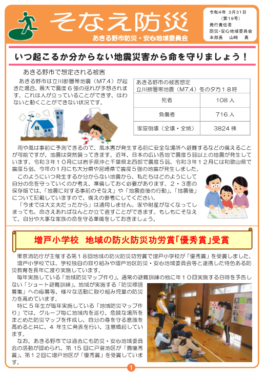そなえ防災第19号(サイズ:1019.34KB)いつ起こるか分からない地震災害から命を守りましょう!/増戸小学校 地域の防火防災功労賞「優秀賞」受賞/~地震に対する事前のそなえ~/自主防災組織活動報告「草花町内会」