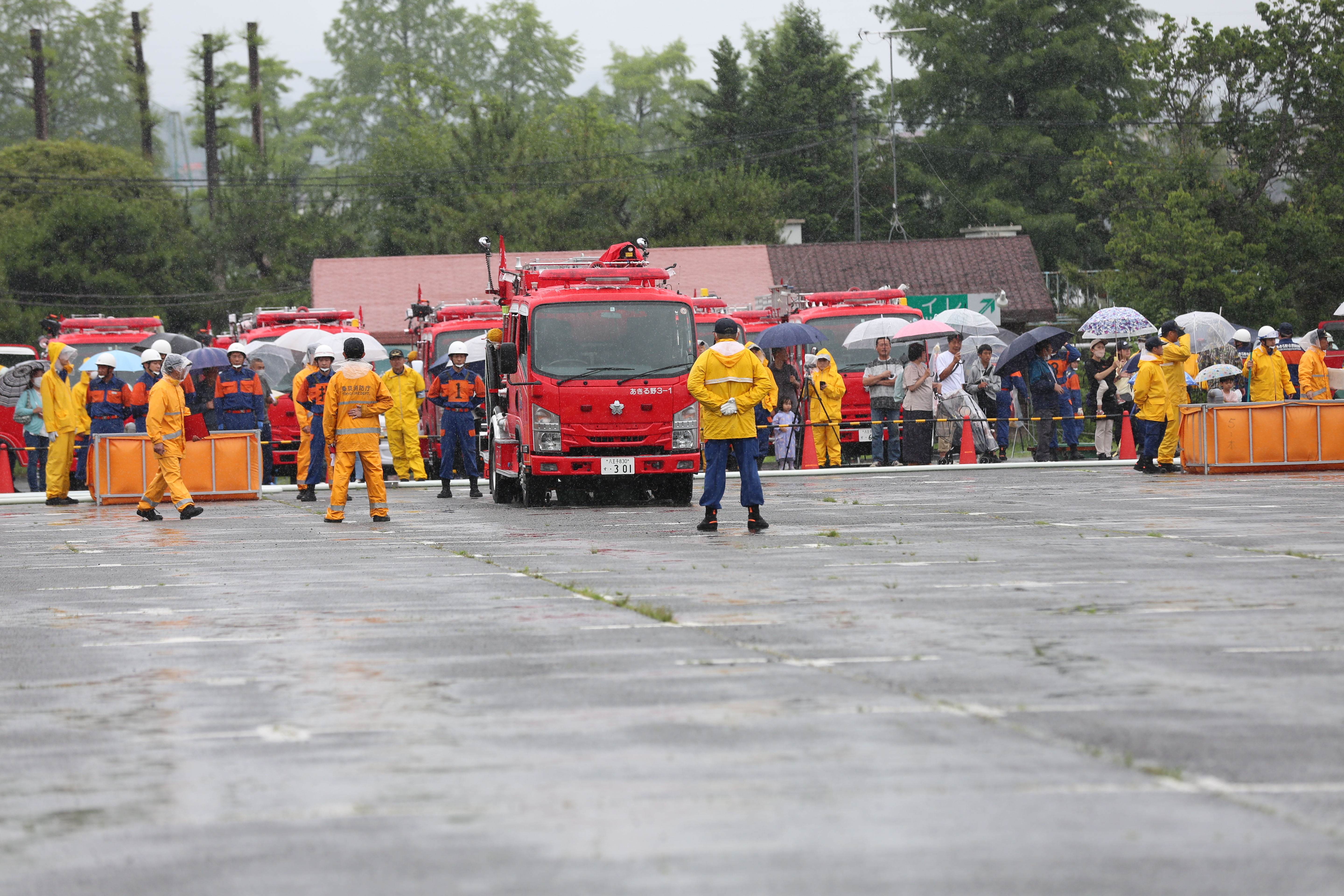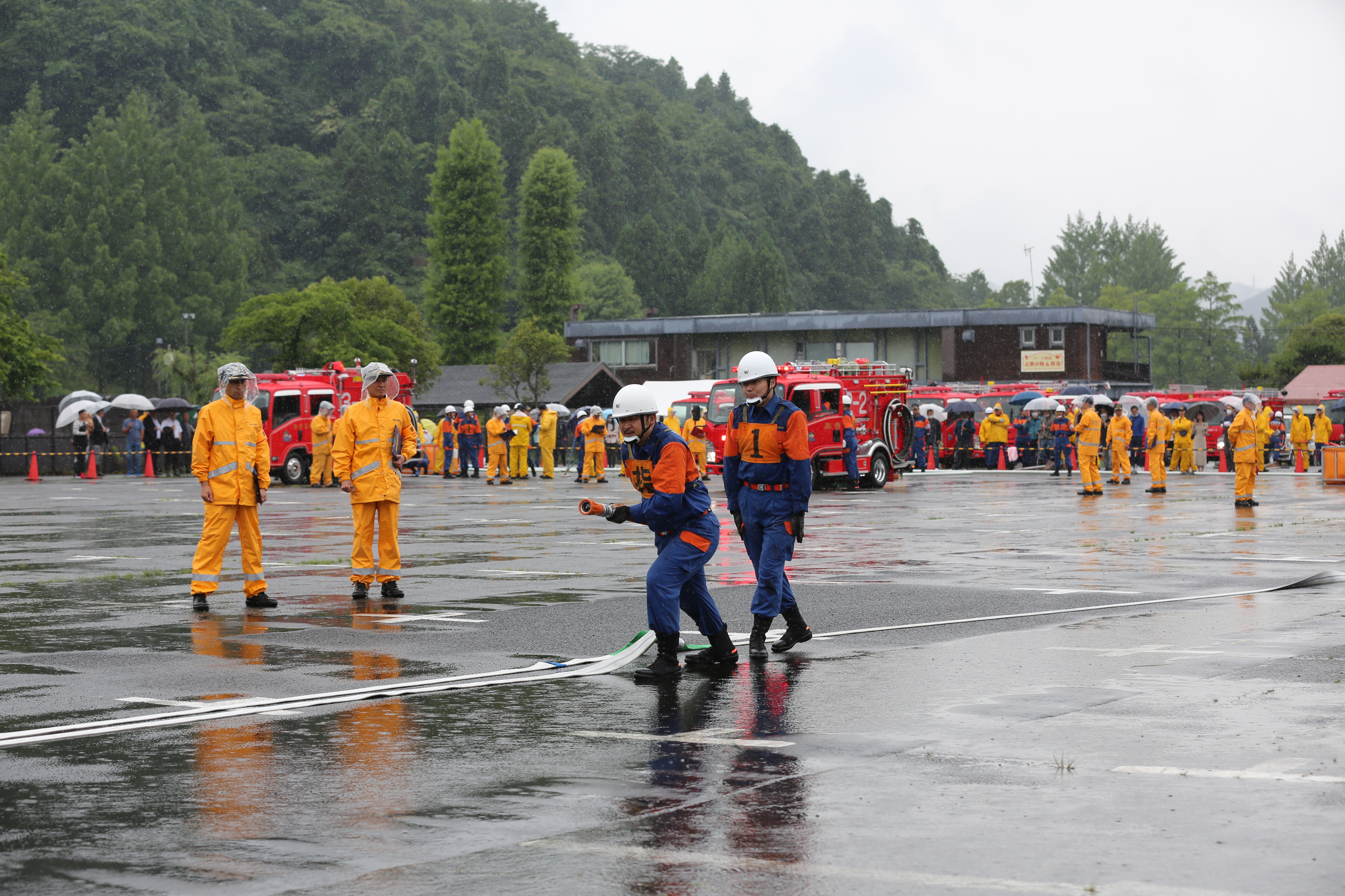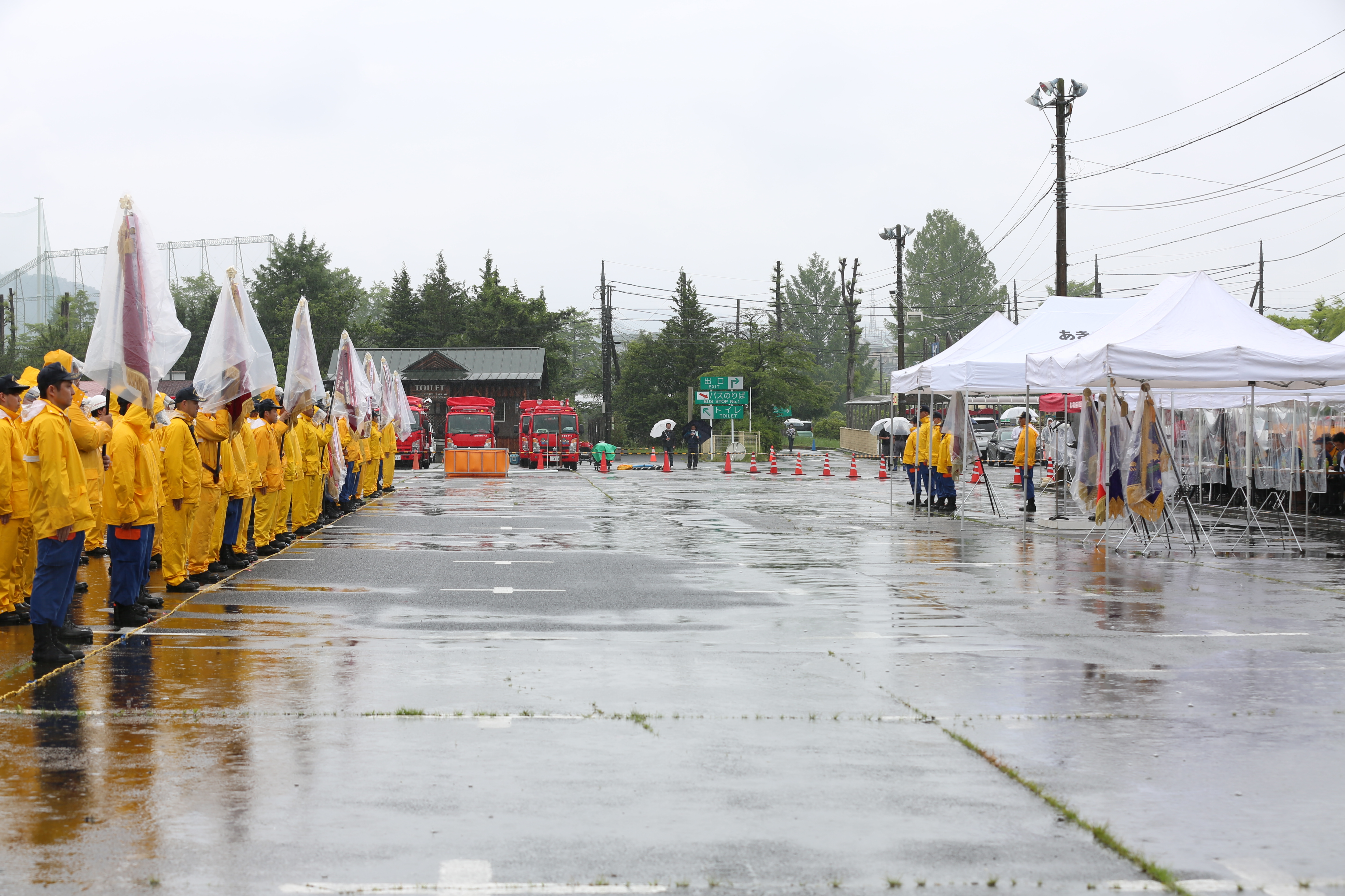 ポンプ自動車の部11隊、小型動力ポンプの部9隊が出場し、選手を含め各部が一丸となり、雨の中気迫のこもった操法を披露しました。