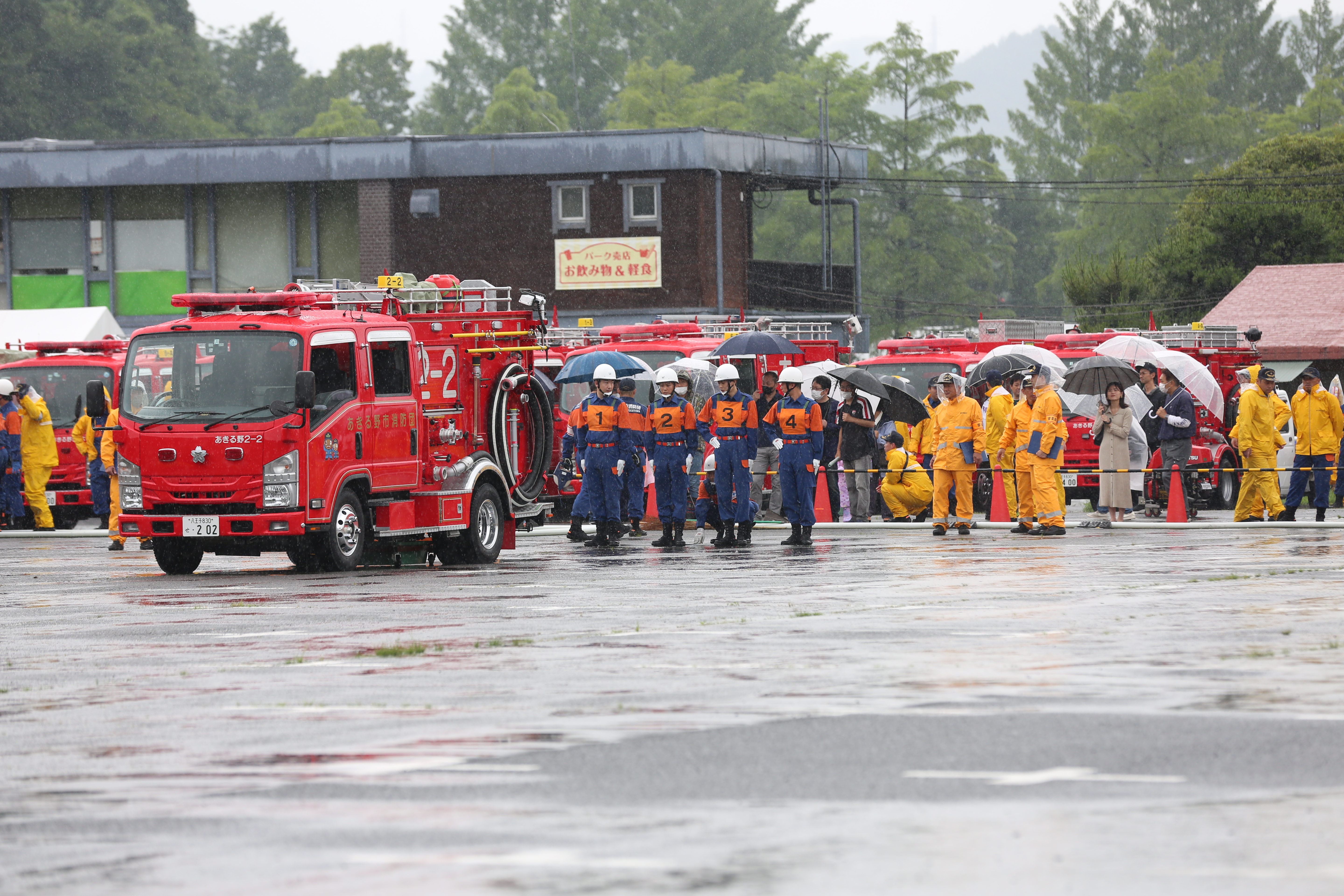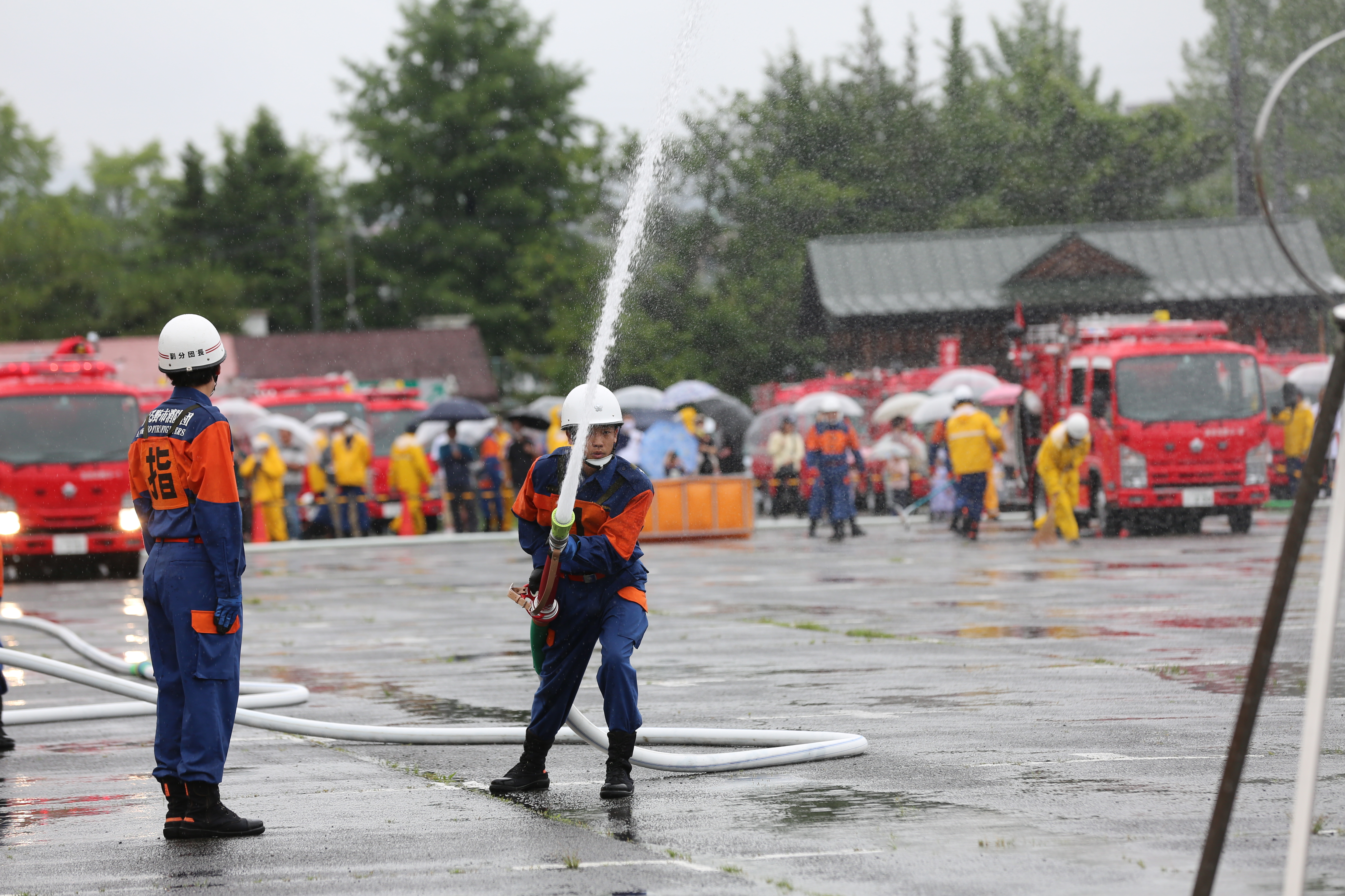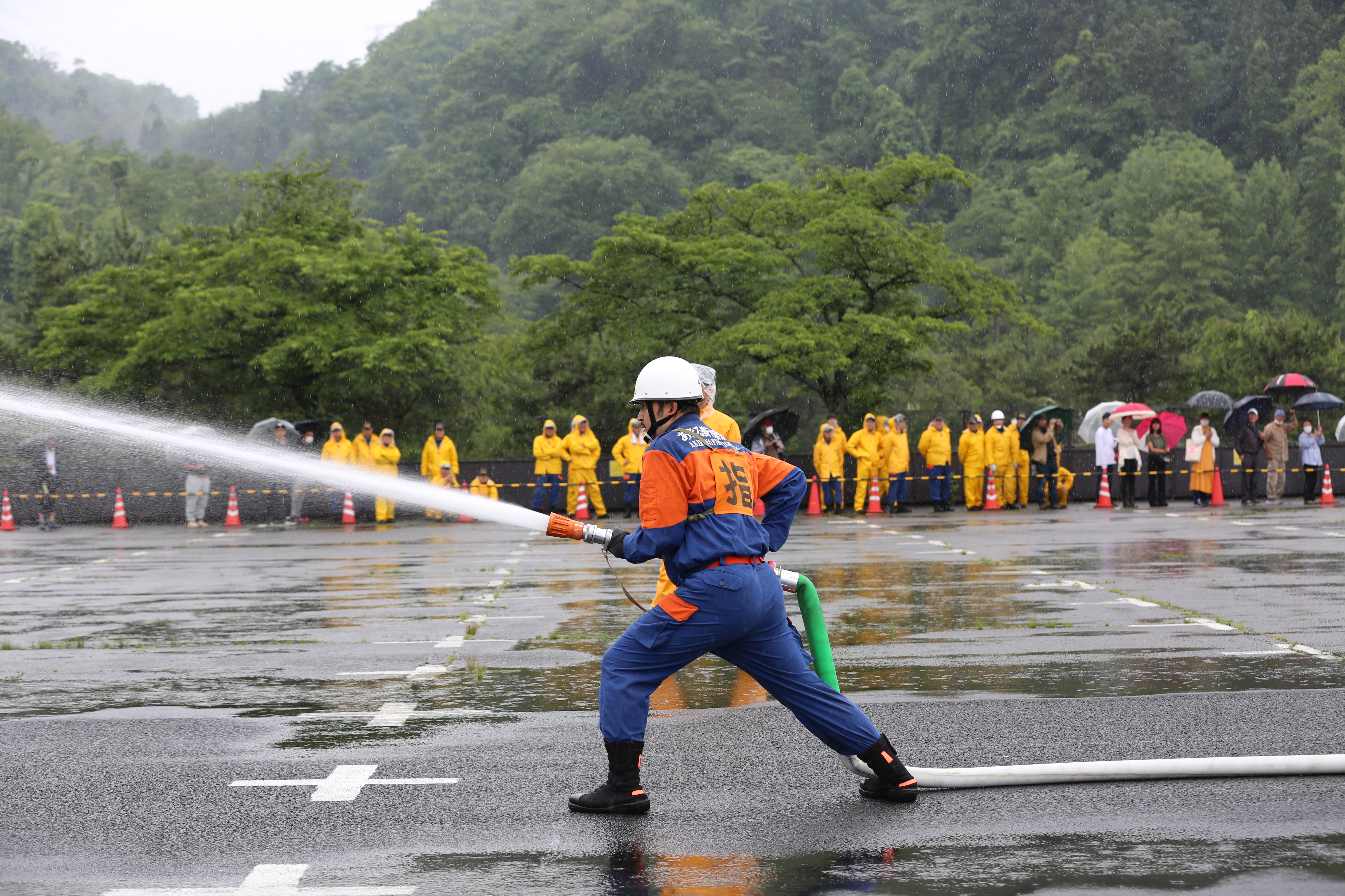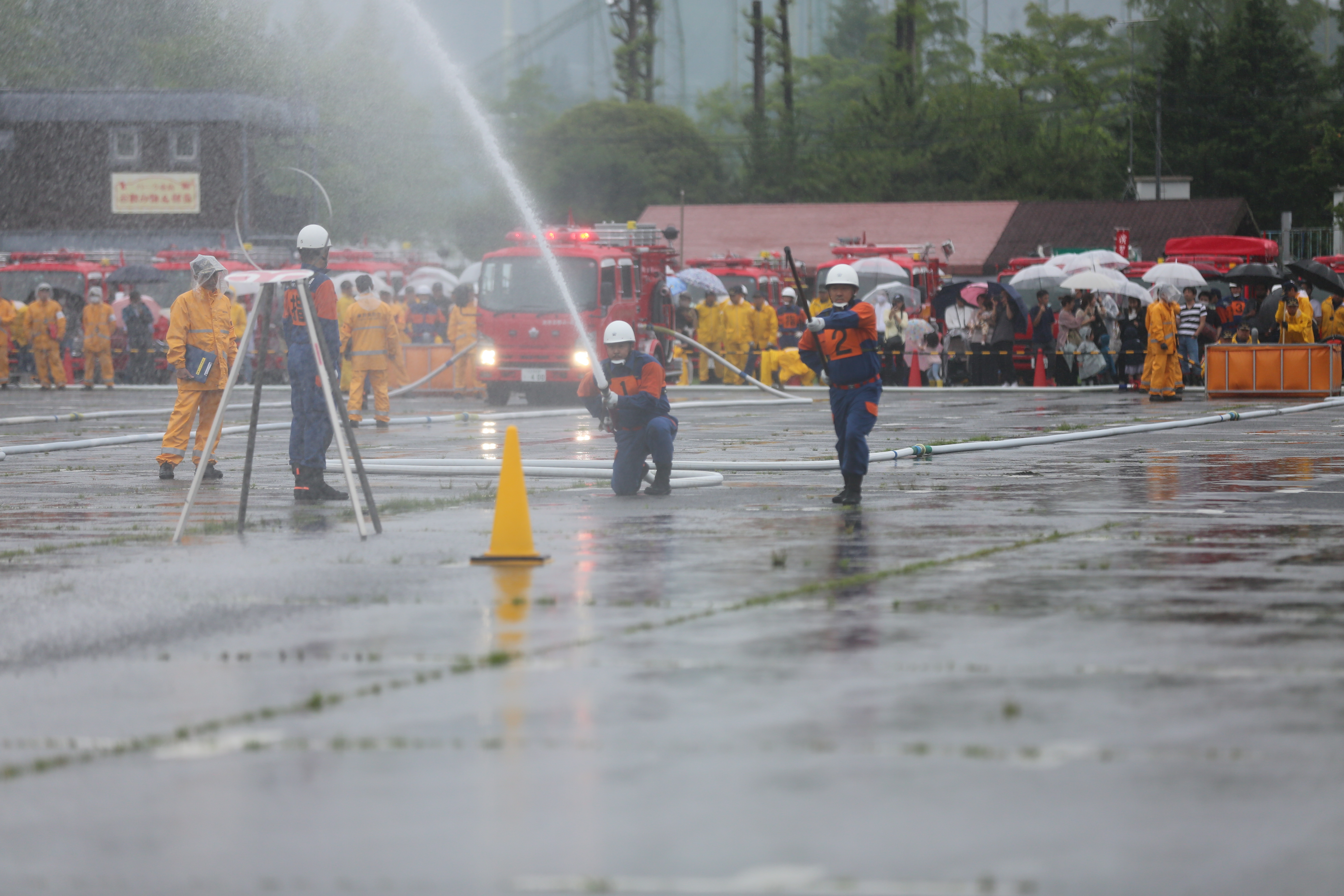ポンプ自動車の部11隊、小型動力ポンプの部9隊が出場し、選手を含め各部が一丸となり、雨の中気迫のこもった操法を披露しました。