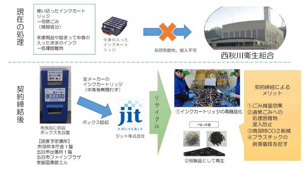 市はジット株式会社(本社:山梨県南アルプス市)と「使用済インクカートリッジの再資源化に関する契約書」を締結し、使用済みインクカートリッジの回収ボックスを市施設4か所に設置することになりました。