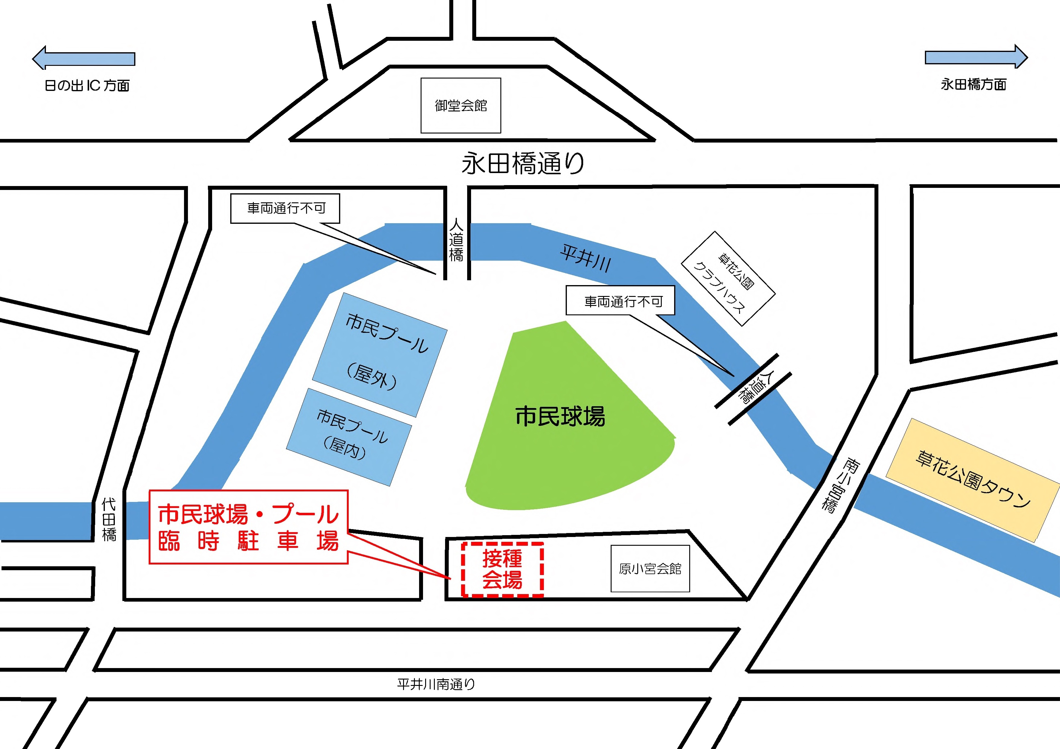 ※菅生交流会館、御堂会館につきましては、市民球場・プール臨時駐車場(南側入口前)に接種会場を統合しました。所在地については、次の案内図をご確認ください。