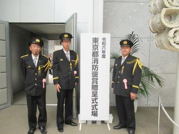 この式典の中で、市川 泰弘氏(第7分団分団長)、矢崎 進一氏(第2分団分団長)、渡邉 泰徳(第3分団副分団長)が長年にわたる献身的な活躍と数々の功績が認められ、東京都消防褒賞を受賞しました。