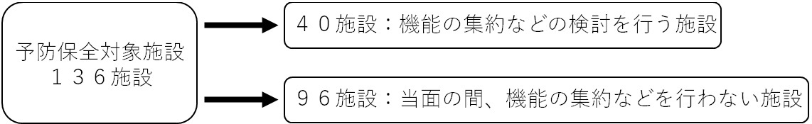 再編等に関する実施計画は、公共施設等個別施設計画で予防保全対象施設とした136施設を対象としています。
