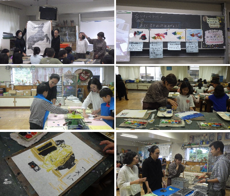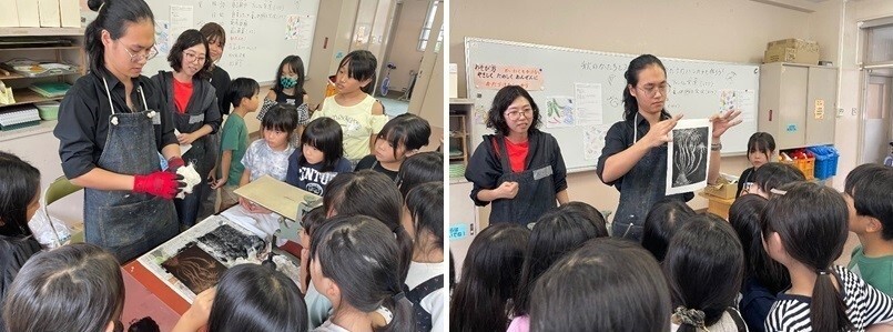 素材を貼り合わせた版画を用いた授業内容に合わせて、招へい作家は子どもたちのそばに寄り添いながら制作のコツなどを丁寧に教えました。