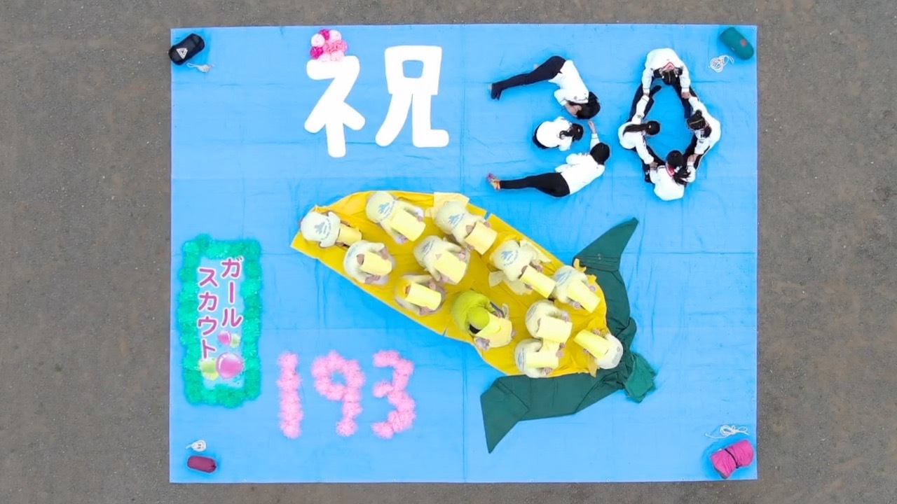 作品紹介:私たち「ガールスカウト東京都第193団」のモチーフでもあり、あきる野市の特産品でもある「とうもろこし」を中心に人文字を構成しました。葉の部分はキャンプで使うテントを使って補いつつ、実の部分は自分たちの体を使っています。他にも四隅に寝袋やロープといった活動で使う道具を配置、30という文字は子どもたちが全身を使って表現しました。