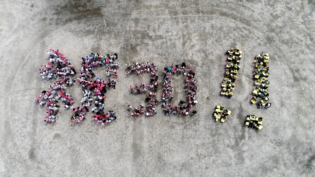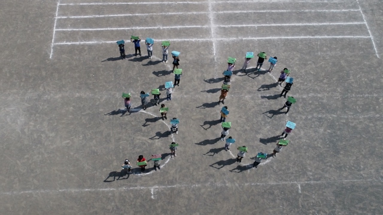 作品紹介:令和9年2月にあきる野学園も30周年を迎えますので、今回の市制施行30周年の人文字を作成することは、あきる野学園にとっても大変感慨深いものでした。児童・生徒一人一人がどうやったら、お祝いの気持ち、うれしい気持ち、楽しい気持ちを表現できるか考え、304人の心を一つに、一生懸命取り組みました。