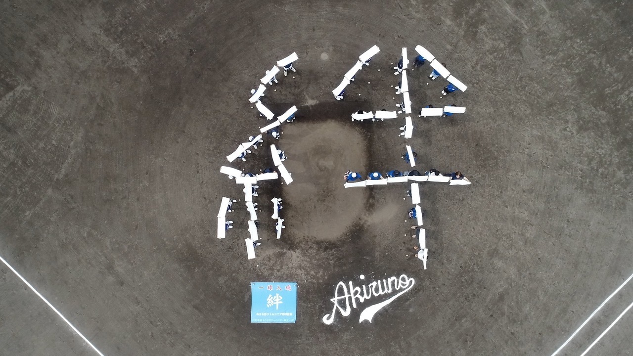 作品紹介:あきる野シニアのチーム団旗が「絆」となっており、30周年実施要領にも沿っているので、人文字を作成するならこれしかないということで「絆」にしました。