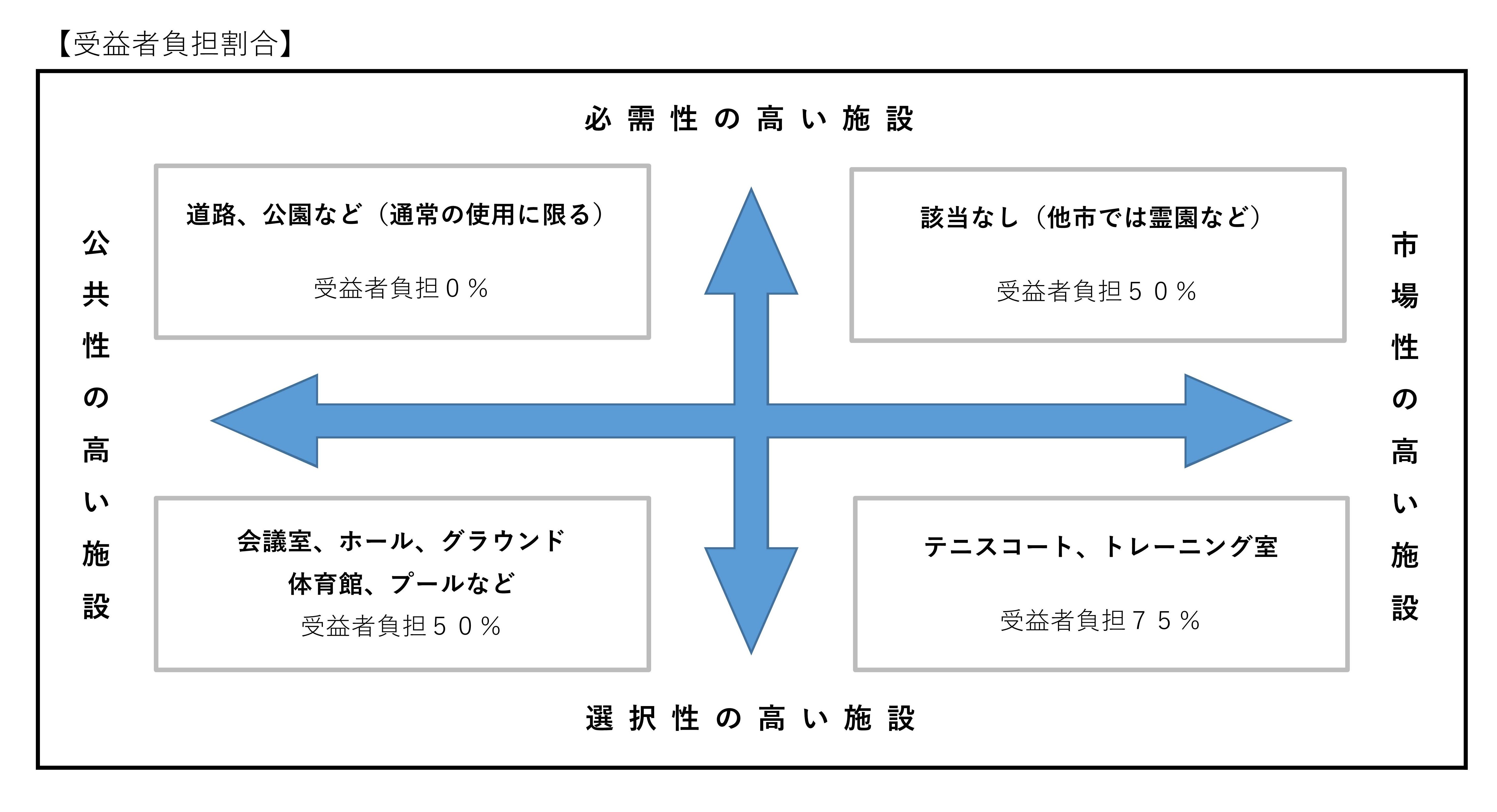 使用料については、施設を4つのグループに区分し、それぞれで受益者負担割合を設定しています。